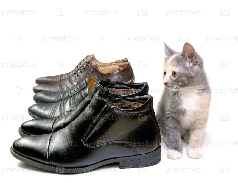 Котенок на фоне мужской обуви. Кот рядом с обувью на белом фоне