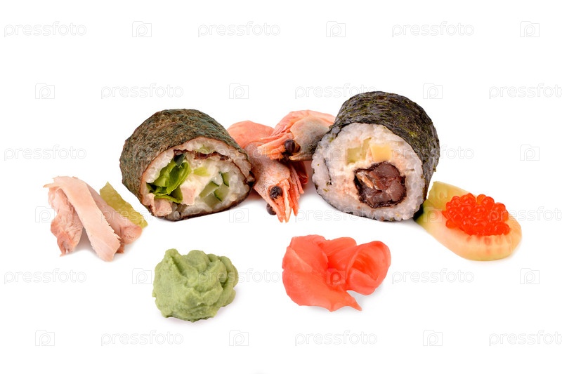Нарезанные суши и ингредиенты на белом фоне