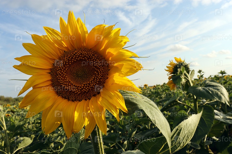Ярко-желтый подсолнух, растущий в поле на фоне вечернего неба