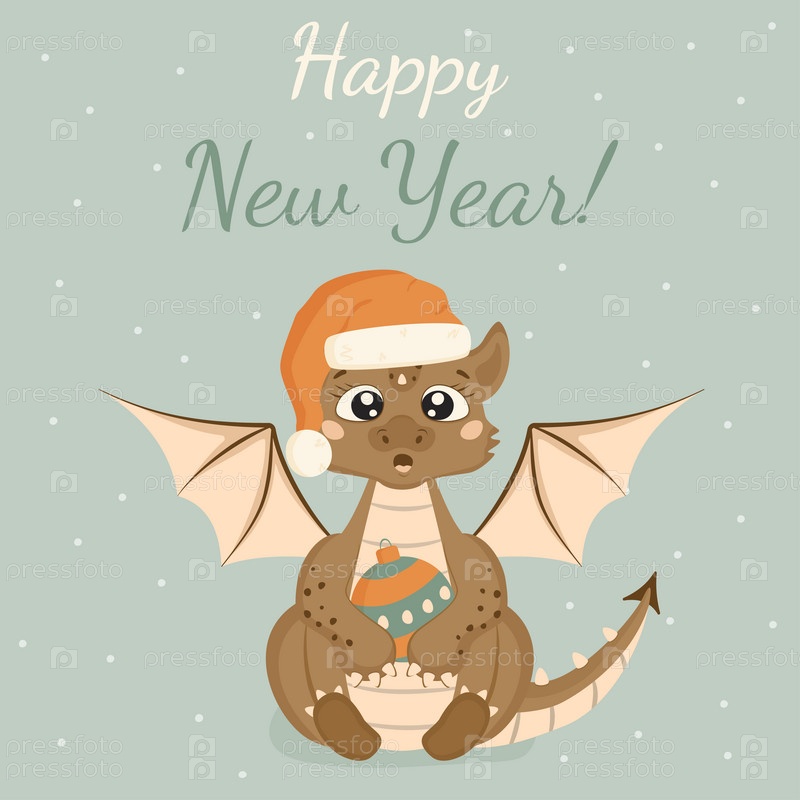 Рождественская открытка в мультяшном стиле. Милый удивленный дракон в шапке Санта-Клауса держит в лапах рождественский шар