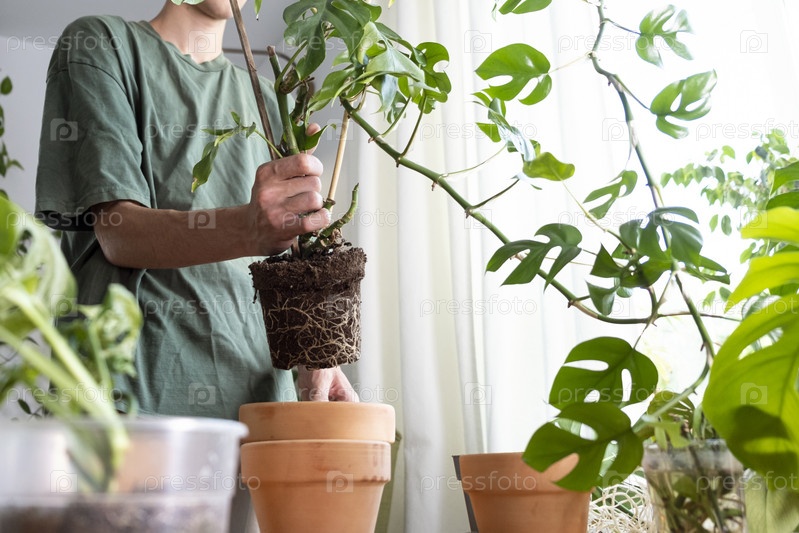 Молодой человек держит в руках побеги мини-монстров Rhaphidophora tetrasperma, которые необходимо сортировать и готовится положить их в глиняный цветочный горшок
