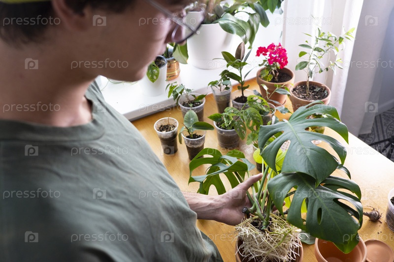 Молодой человек держит в руках Monstera deliciosa, корни швейцарского сыра, побеги для сортировки и готовится положить их в глиняный цветочный горшок
