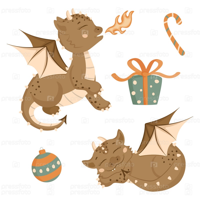 Рождественский набор в мультяшном стиле. Милые дракончики, подарочная коробка, елочный шар, карамельный леденец