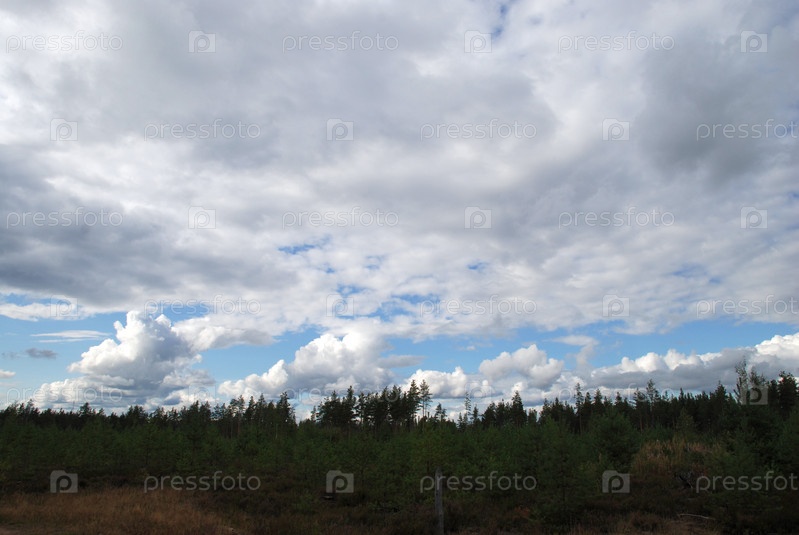 Молодой хвойный лес под облаками