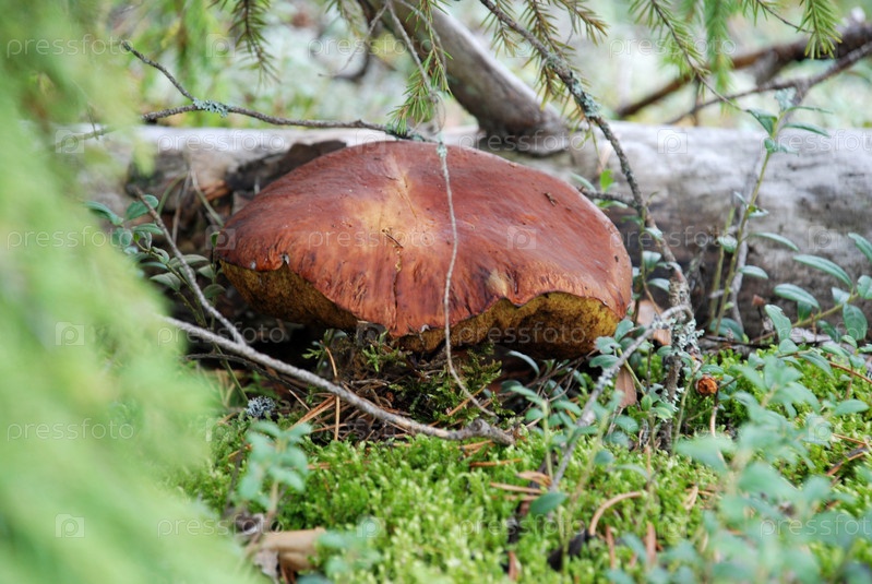 Белый гриб вырос возле упавшего ствола