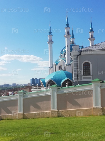 Казанский кремль: вид на внутренний двор, крепостные стены, мечеть Кул-Шариф в солнечный летний день