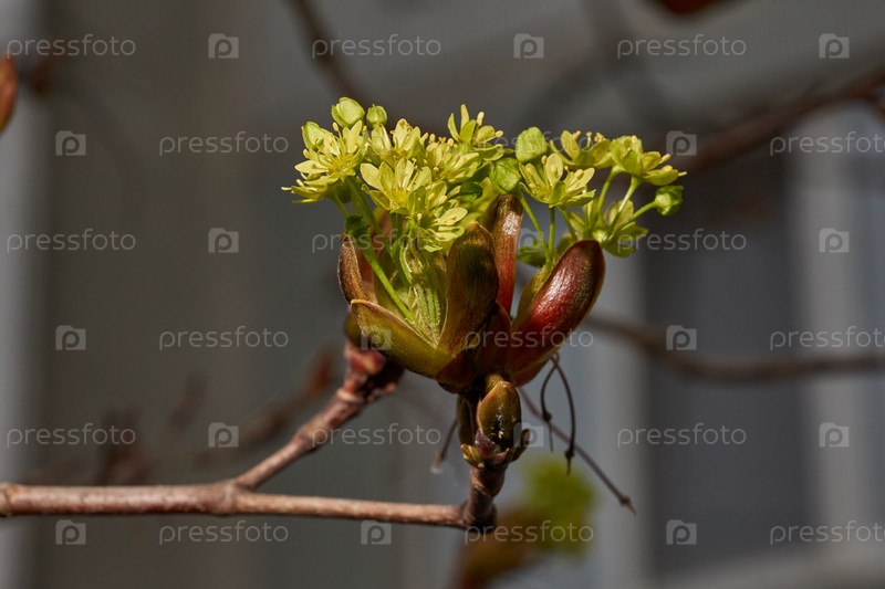 Растворяются цветочные почки остролистного клёна (лат. Acer platanoides). Деревянный вид растения рода Асер семейства Сапиндовых