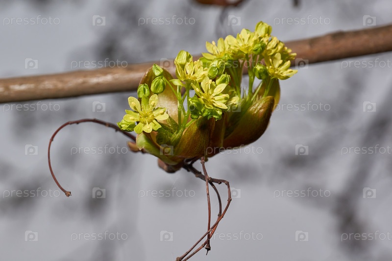 Растворяются цветочные почки остролистного клёна (лат. Acer platanoides). Деревянный вид растения рода Асер семейства Сапиндовых