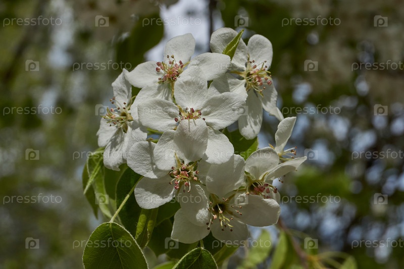 В саду цветет груша. Цветы груши крупным планом на фоне кроны дерева. Весна