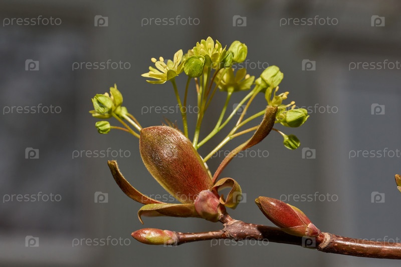 Растворяются цветочные почки остролистного клёна (лат. Acer platanoides). Деревянный вид растения рода Асер семейства Сапиндовых
