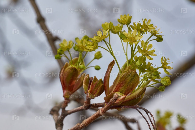 Растворяются цветочные почки остролистного клёна (лат. Acer platanoides). Деревянный вид растения рода Асер семейства Сапиндовых