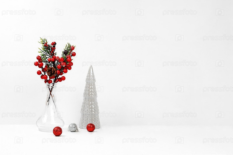 Рождественский и новогодний декор для дома. Ветви с красными ягодами, еловыми ветвями и украшениями в стеклянной вазе с современной елкой на минимальном светлом пустом фоне. Макет для дизайна и демонстрации продукции