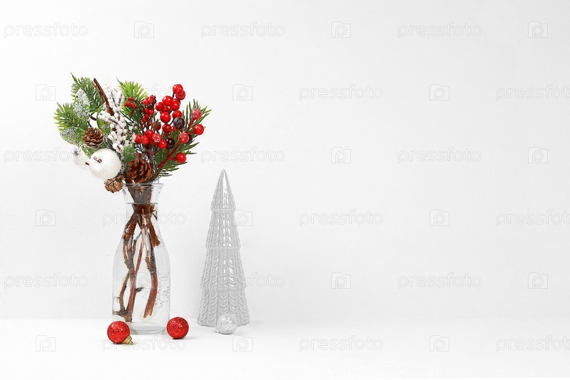 Рождественский и новогодний декор для дома. Ветви с красными ягодами, еловыми ветвями и украшениями в стеклянной вазе с современной рождественской елкой на минимальном светлом пустом фоне. Макет для дизайна и демонстрации продукта, выборочный фокус