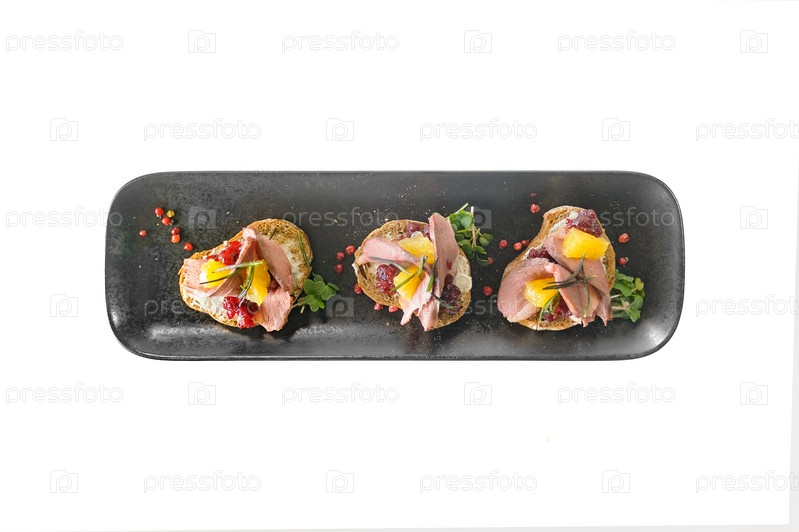 Брускетта с уткой, брусничным джемом и апельсином на изолированном тосте из черной чиабатты