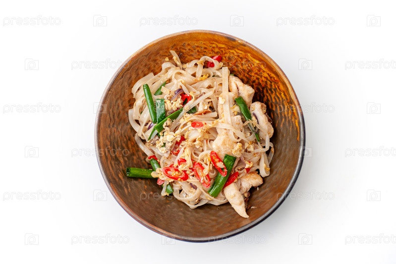 Лапша Пад Тай Удон в коричневой тарелке, вид сверху. Еда в азиатском стиле изолирована