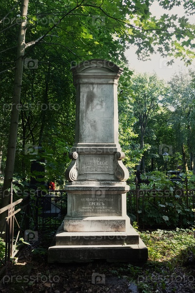Старинный могильный памятник с барельефом среди зеленых деревьев - Смоленское лютеранское кладбище, Санкт-Петербург, Россия, Июль 2023