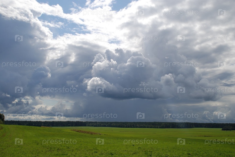Бело-голубые облака над зеленым полем. Над большим неровным полем с зеленой травой, по краям которого растет лес, низко висят большие белые дождевые облака, сквозь которые проглядывает голубое небо