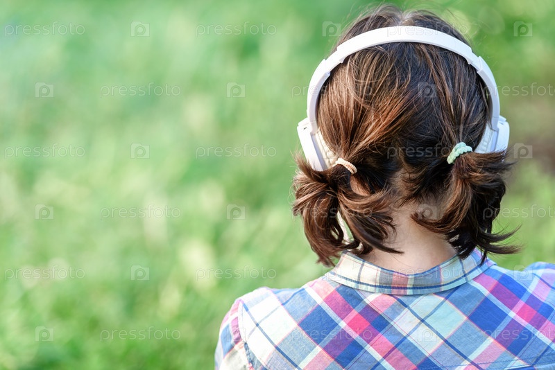 Голова девушки в наушниках крупным планом на природе, солнечно