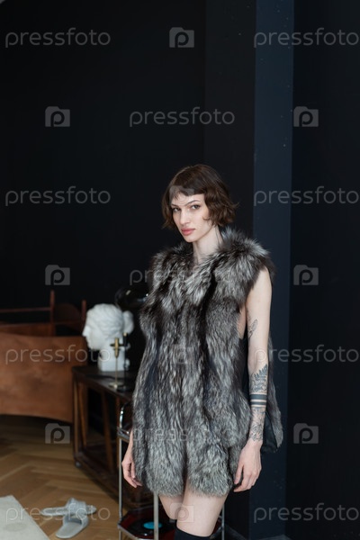 Молодая красивая женщина позирует в шубе в студии