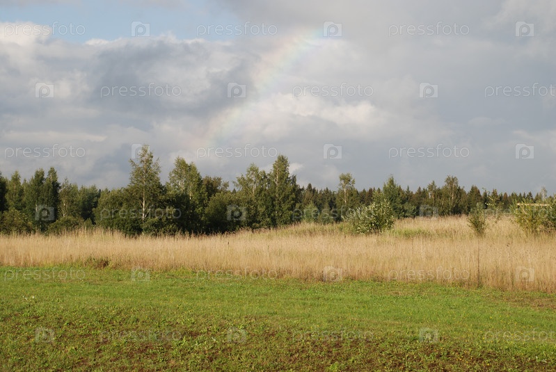 Бело-голубые облака над зеленым полем. Над большим неровным полем с зеленой травой, по краям которого растет лес, низко висят большие белые дождевые облака, сквозь которые проглядывает голубое небо