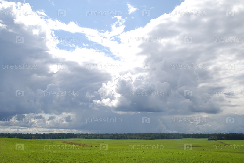 Бело-голубые облака над зеленым полем. Над большим неровным полем с зеленой травой, по краям которого растет лес, низко висят большие белые дождевые облака, сквозь которые проглядывает голубое небо
