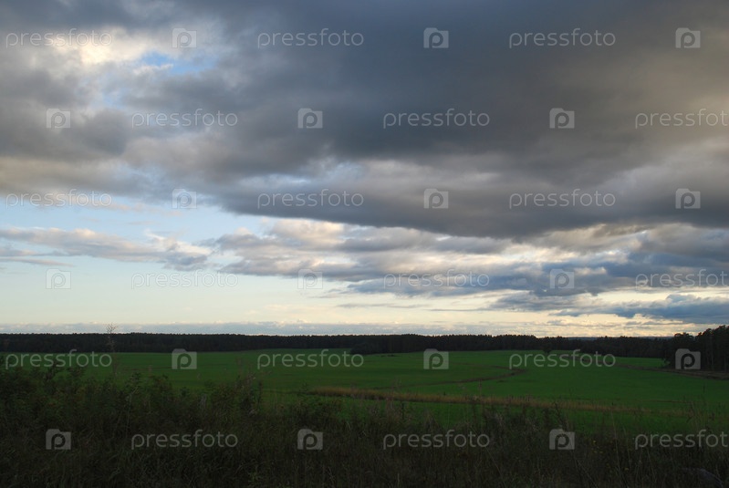 Бело-голубые облака над зеленым полем. Над большим неровным полем зеленой травы низко висят большие белые дождевые облака, сквозь которые проглядывает голубое небо