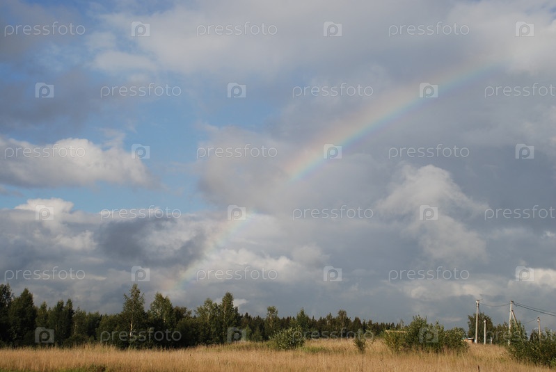 Бело-голубые облака над зеленым полем. Над большим неровным полем с зеленой травой, по краям которого растет лес, низко висят большие белые дождевые облака, сквозь которые проглядывает голубое небо