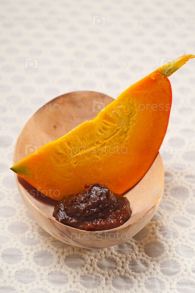 Свежий ломтик тыквы на деревянной чаше