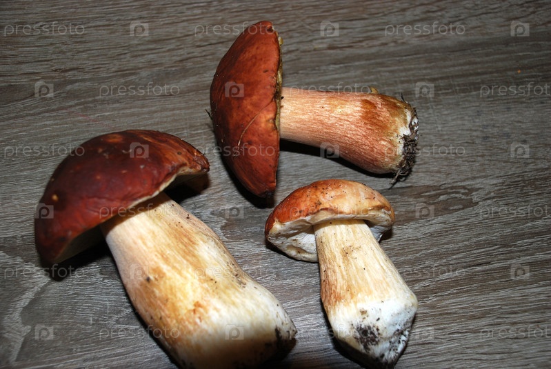 На столе лежит несколько белых грибов. Собранные белые грибы разных размеров лежат на серой поверхности. У них темно-коричневые шляпки и белые ноги. Грибы собирают в лесу