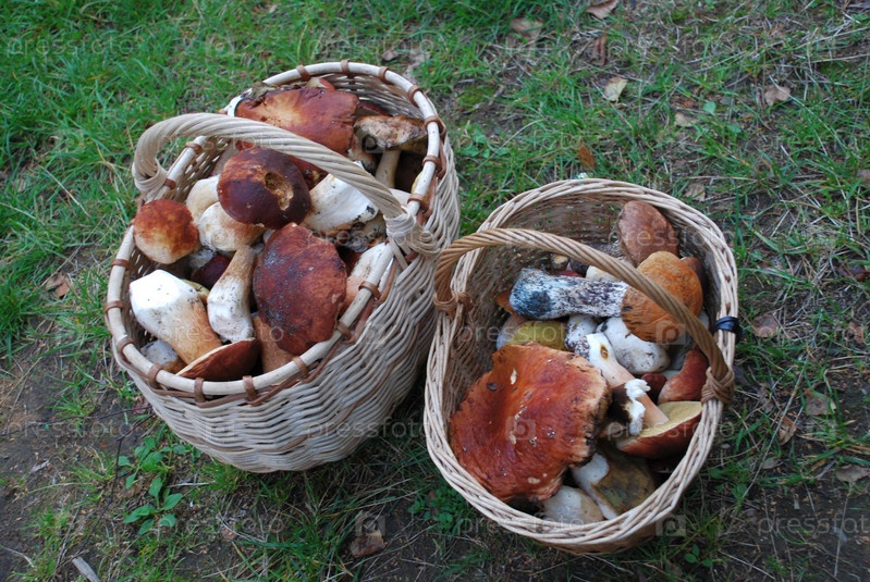На земле стоит корзинка с грибами. На зеленой траве стоит большая плетеная корзина, наполненная собранными белыми грибами разных размеров. Корзина светло-коричневая