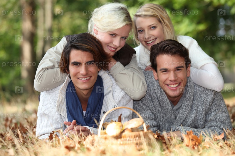 Группа друзей лежит в осенней траве