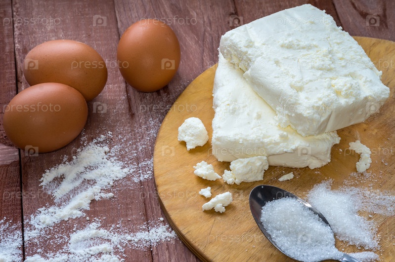 Творог и яйца на столе. Продукты для творожных тортов. Готовим творог