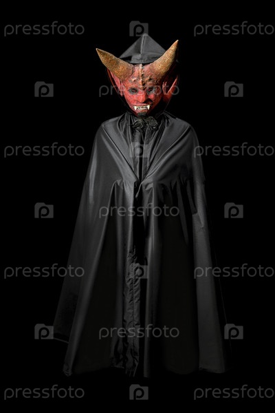 Дьявол в плаще на черном фоне. Мужчина в страшной маске с рогами. Хэллоуин праздник