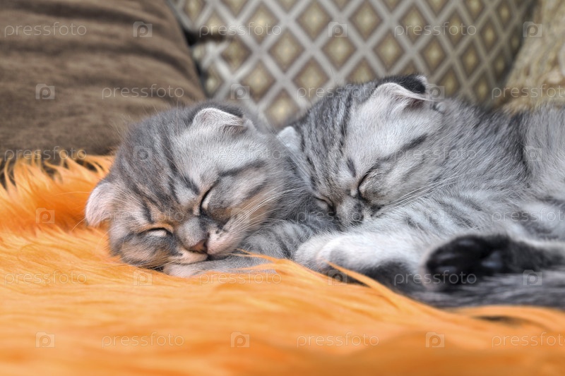 Два шотландских вислоухих котенка комфортно спят дома на диване