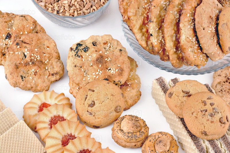 Сладкое овсяное печенье в тарелке и вафли на белом столе. Различные кондитерские изделия