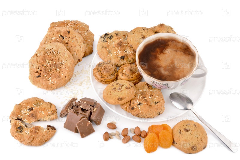 Овсяное печенье на белом столе с чашкой кофе с молоком