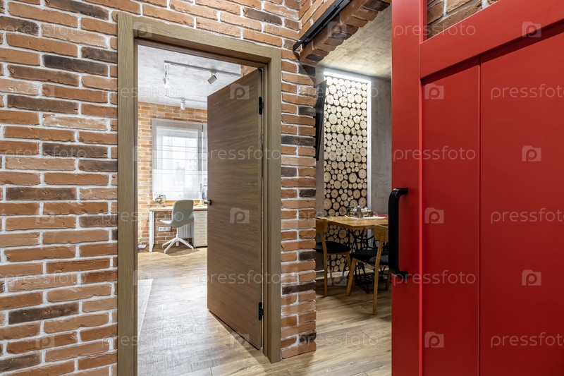 Интерьер квартиры с раздвижной красной дверью и отделкой стен из глиняного красного кирпича