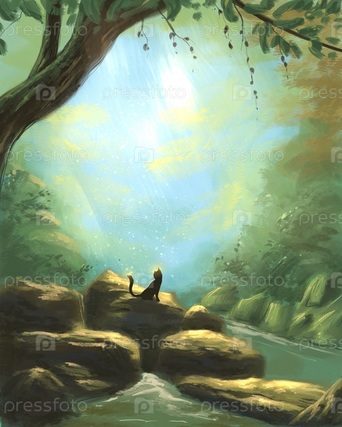 Кот и лесной водопад