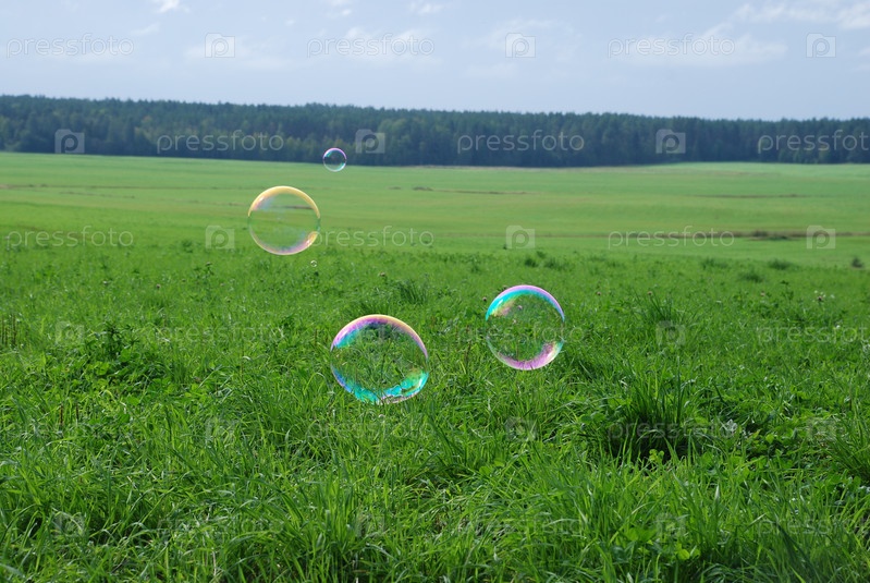 Большие мыльные пузыри в воздухе. Большие округлые мыльные пузыри летают на фоне поля с зеленой травой. Деревья отражаются на поверхности пузырьков и переливаются всеми цветами радуги