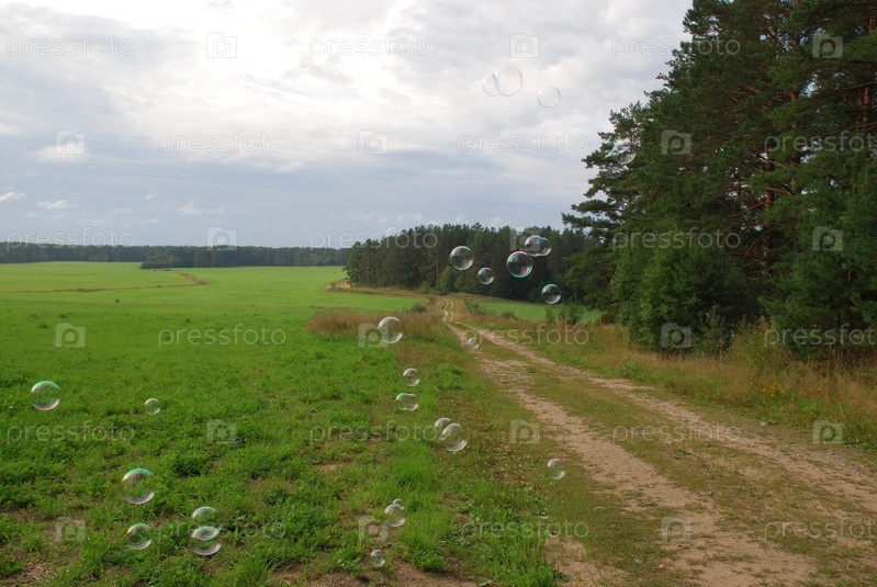 Большие мыльные пузыри в воздухе. Большие округлые мыльные пузыри летают на фоне поля с зеленой травой. Деревья отражаются на поверхности пузырьков и переливаются всеми цветами радуги