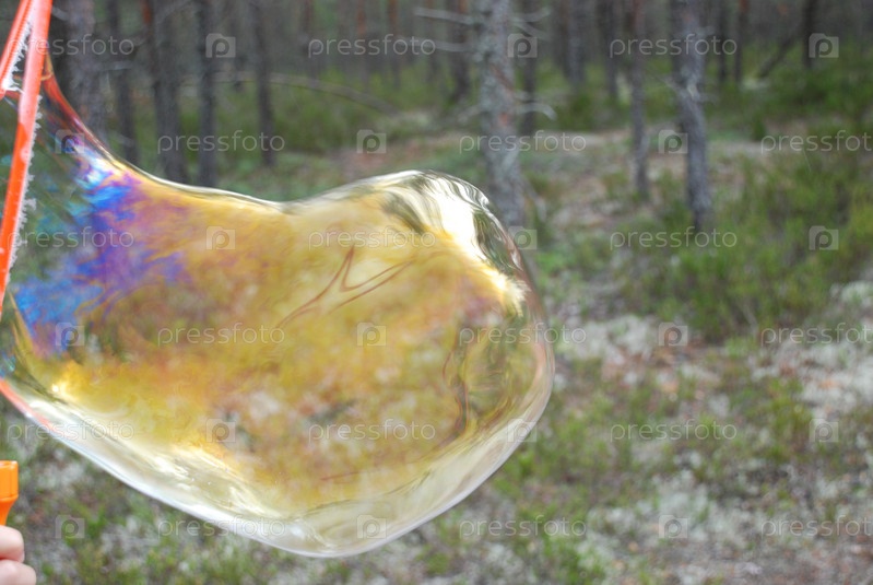 Большие мыльные пузыри в воздухе. На фоне высоких зеленых деревьев летают большие округлые мыльные пузыри. Деревья отражаются на тонкой поверхности пузыря и переливаются всеми цветами радуги