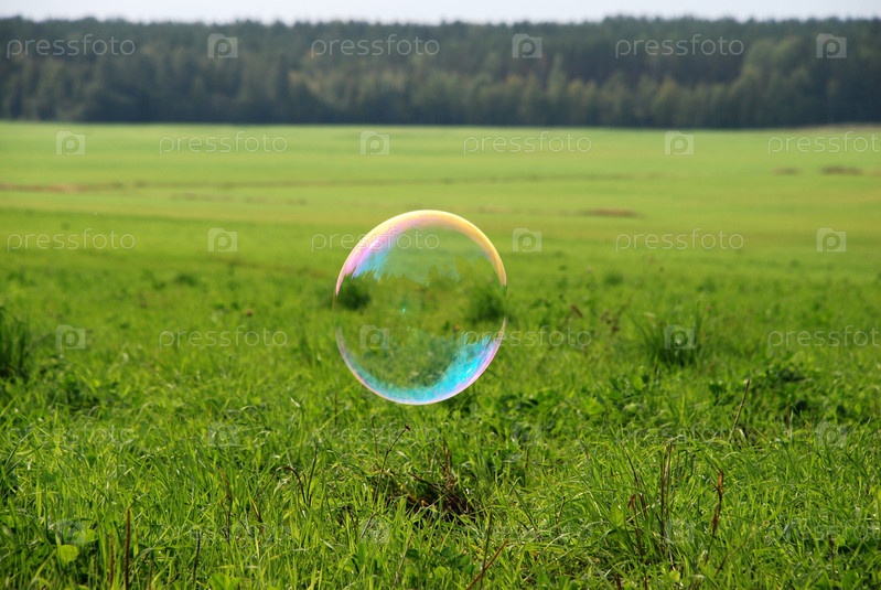 Большие мыльные пузыри в воздухе. Большие округлые мыльные пузыри летают на фоне поля с зеленой травой. Деревья отражаются на поверхности пузырьков и переливаются всеми цветами радуги