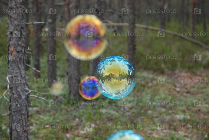 Большие мыльные пузыри в воздухе. На фоне высоких зеленых деревьев летают большие округлые мыльные пузыри. Деревья отражаются на тонкой поверхности пузыря и переливаются всеми цветами радуги