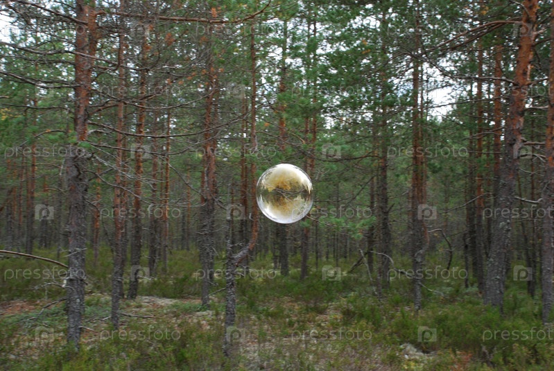 Большие мыльные пузыри в воздухе. На фоне высоких зеленых деревьев летают большие округлые мыльные пузыри. Деревья отражаются на тонкой поверхности пузыря и переливаются всеми цветами радуги