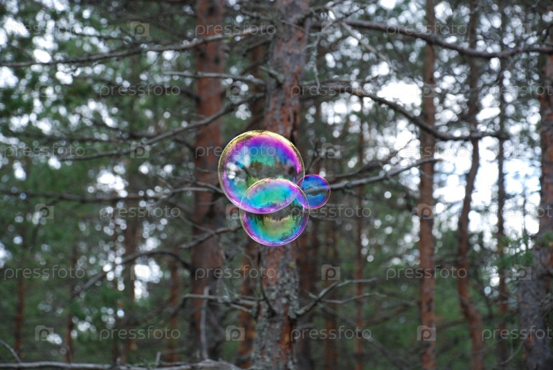 Большие мыльные пузыри в воздухе. На фоне высоких зеленых деревьев летают большие округлые мыльные пузыри. Деревья отражаются на тонкой поверхности пузыря и переливаются всеми цветами радуги