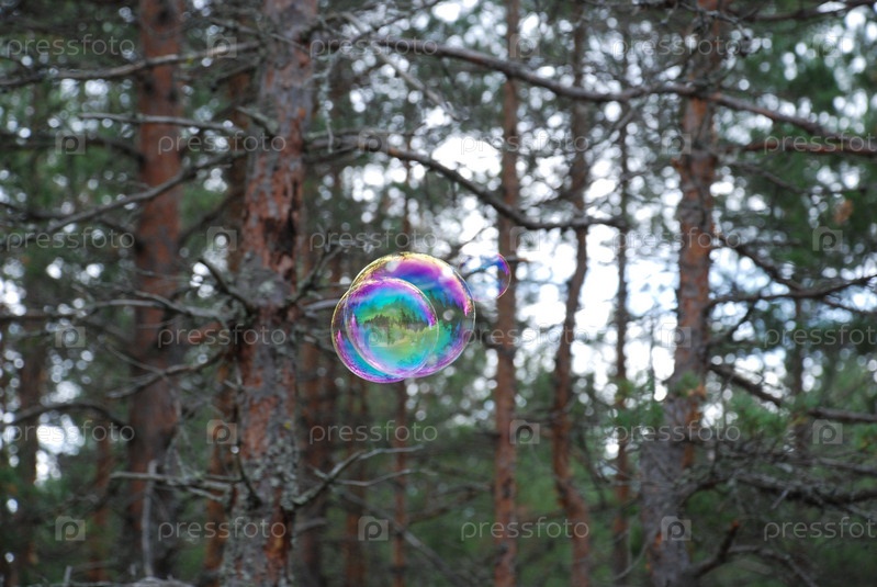 Большие мыльные пузыри в воздухе. На фоне высоких зеленых деревьев летают большие округлые мыльные пузыри. Деревья отражаются на тонкой поверхности пузыря и переливаются всеми цветами радуги