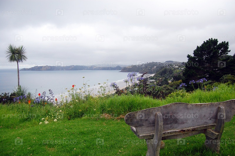 Вид на морской залив с деревянной скамьи