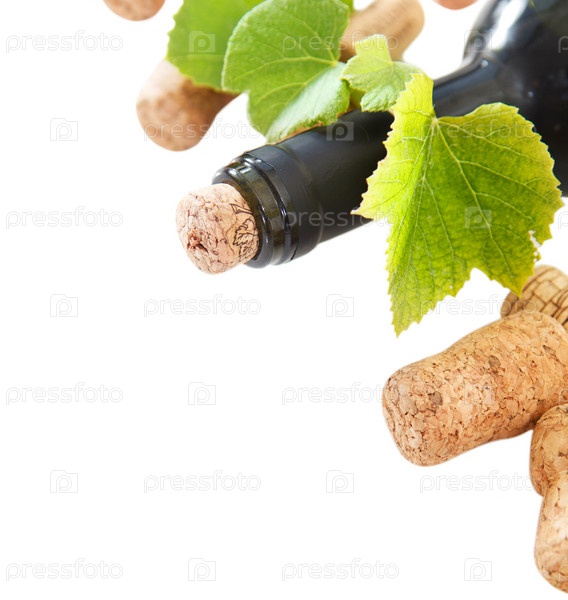 Пробки от бутылок и бутылка на белом фоне