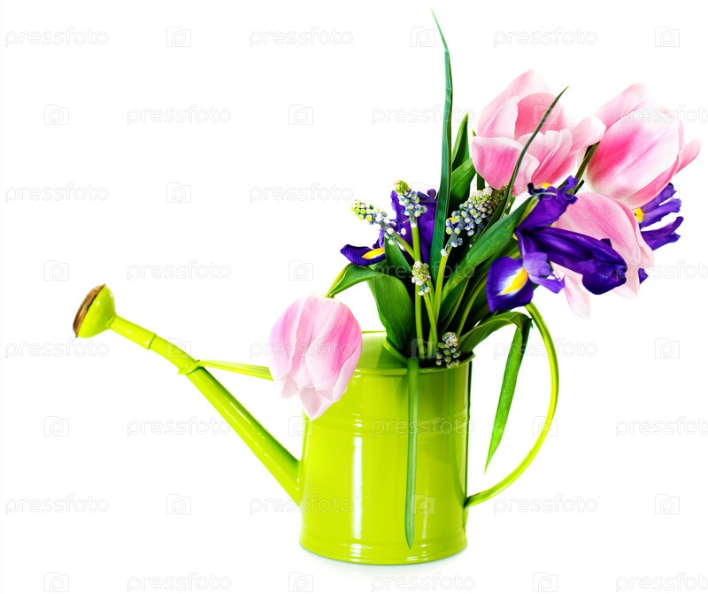 Букет из розовых тюльпанов, фиолетовых ирисов и мускари
