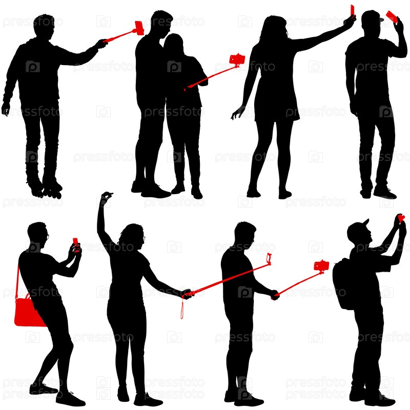 Установите силуэты мужчины и женщины, делающих селфи со смартфоном на белом фоне